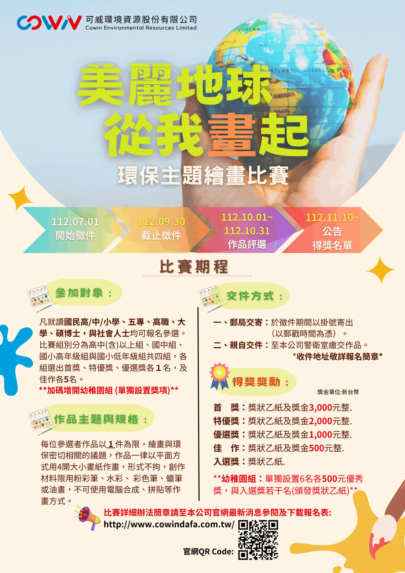 這是展現對環境保護議題高度關注和重要性的機會,同時也是向世界傳達我們共同綠色訴求的方式之一。每一位參賽者都有能力為地球的未來貢獻一份心力!如果您對這場比賽感到興趣,敬請下載詳閱比賽簡章,並於徵稿截止日112/9/30前投稿報名。期待您創作出一幅能夠生動表達您對我們美麗地球和環保重要性的畫作。讓我們攜手共建綠色地球!