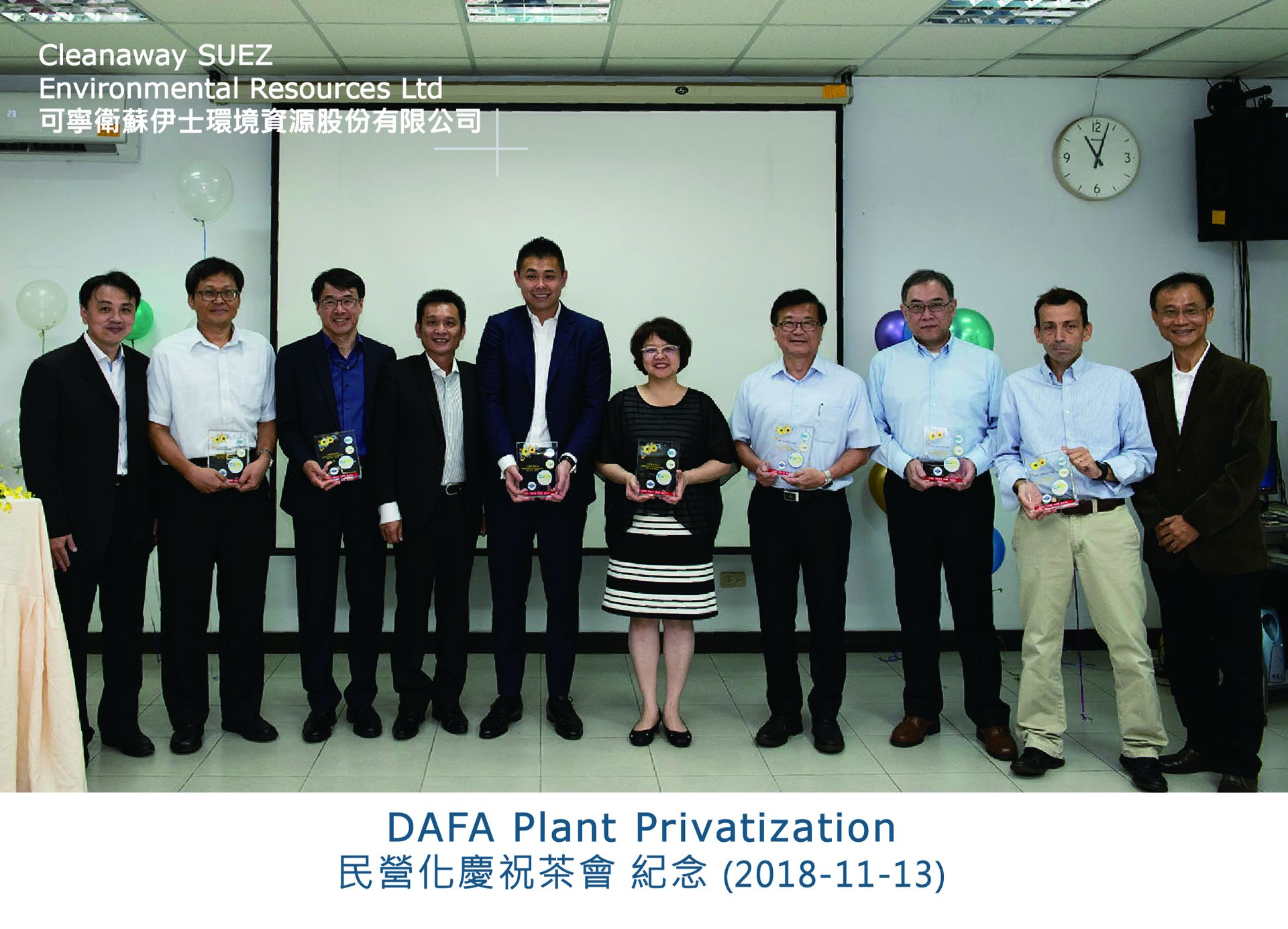 可寧衛蘇伊士環境資源(股)公司大發廠於11月1日正式民營化,由可寧衛、蘇伊士新創建以及榮民工程所組成的管理團隊於11月13日舉辦民營化暨新公司營運慶祝茶會,邀請三方股東代表以及貴賓與會,會中由可寧衛蘇伊士董事長陳文宏先生頒發紀念水晶座給榮工公司董事長張筱貞女士,並介紹新公司管理團隊給與會貴賓認識並發表感言,場面溫馨、激勵人心,最後透過開香檳以及光球啟動儀式,展現大發廠的氣勢以及成為台灣最佳廢棄物處理廠的企圖心。