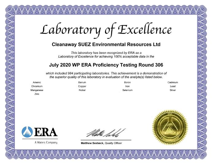 本公司實驗室參與2020年7月ERA國際能力試驗機構舉辦之重金屬盲樣測試,共計13項重金屬元素通過試驗。展現出本公司實驗室檢測能力與水準,提供準確的廢棄物參數讓操作單位作為處理依據。本公司實驗室將每年參與試驗並期望能持續提高並維持操作處理過程之品質。