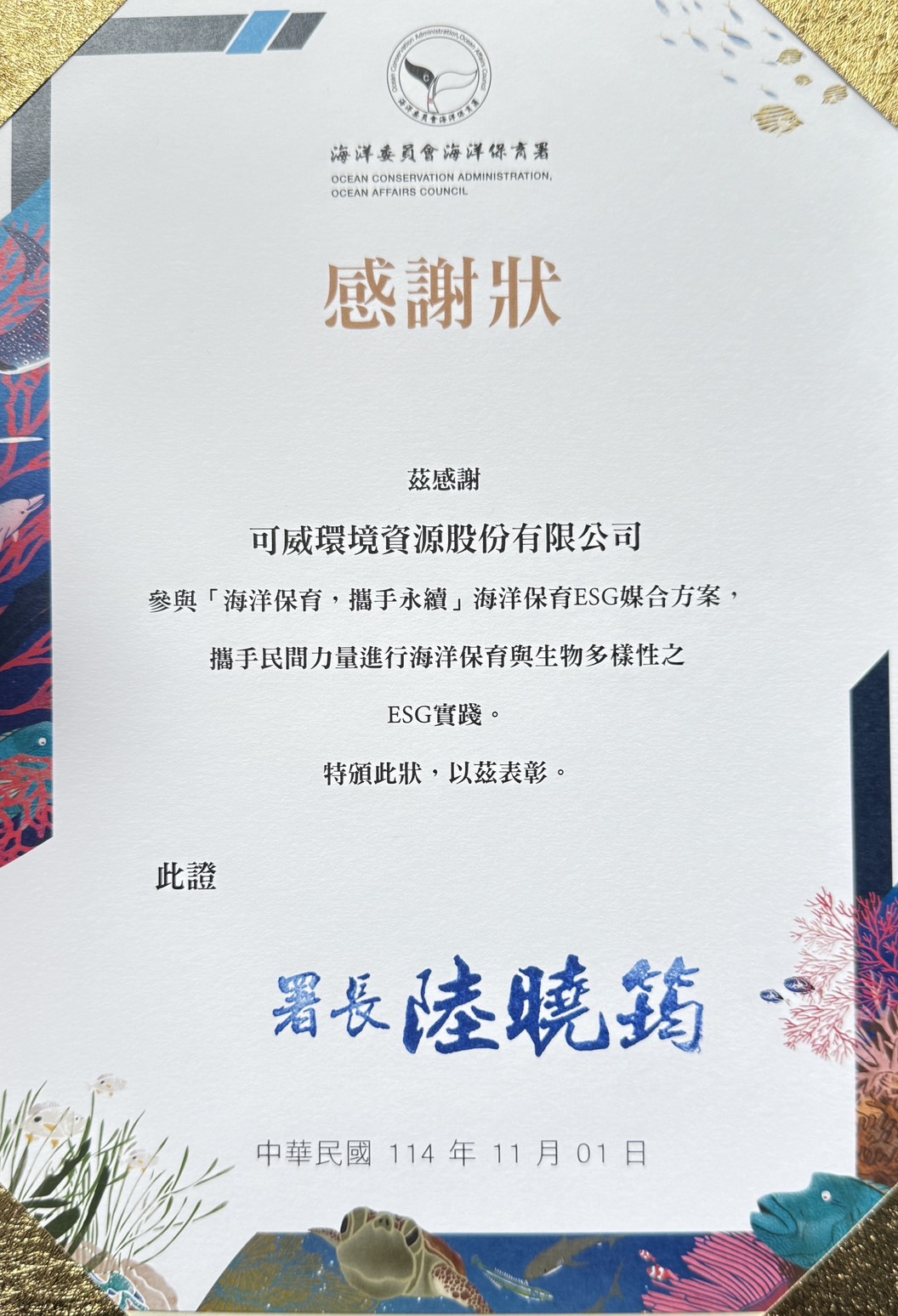 今日(11/1)海保署於臺灣科學教育館舉行表揚大會,由署長陸曉筠親自頒發感謝狀,表彰17家積極投入海洋保育行動的企業及各共同守護海洋的團體,可威公司亦名列其中。