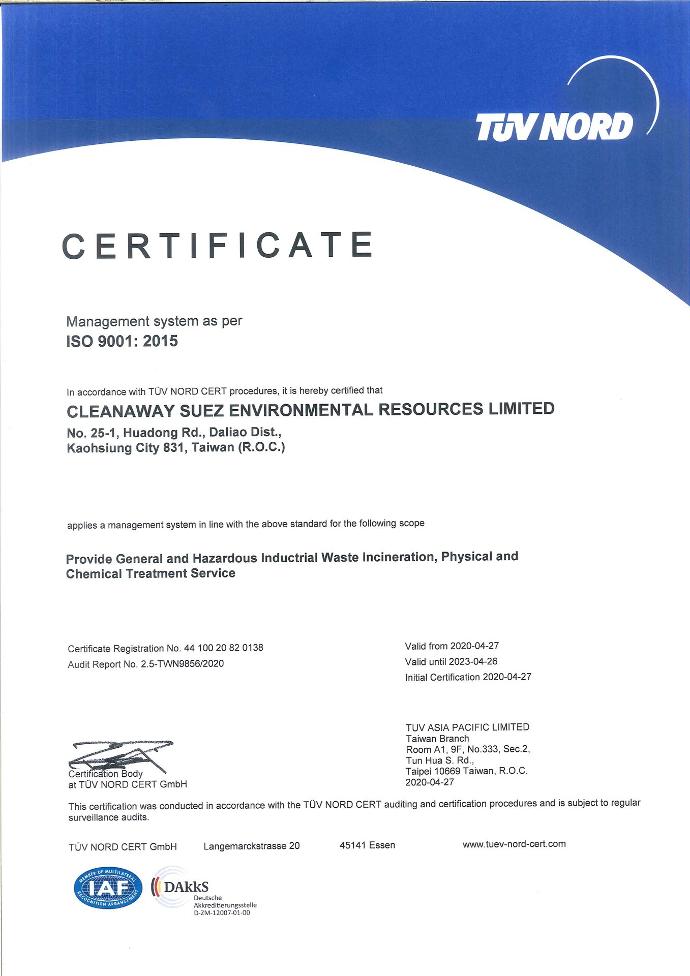 可寧衛蘇伊士公司大發事業廢棄物處理廠於5月份正式通過TUV NORD 台灣分公司的驗證取得ISO 9001:2015 品質管理系統證書,這也是大發廠取得相關國際認證的重要里程碑,公司團隊並將於下半年度積極準備ISO 45001職業安全衛生系統認證。